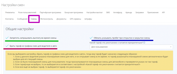 - Тонкая настройка общих параметров смен – CRM позволяет установить запрет на вывод средств во время смены, разрешить водителю выбирать тариф. А также задать тариф по умолчанию и активировать обязательную фиксацию километража до и начала смены.