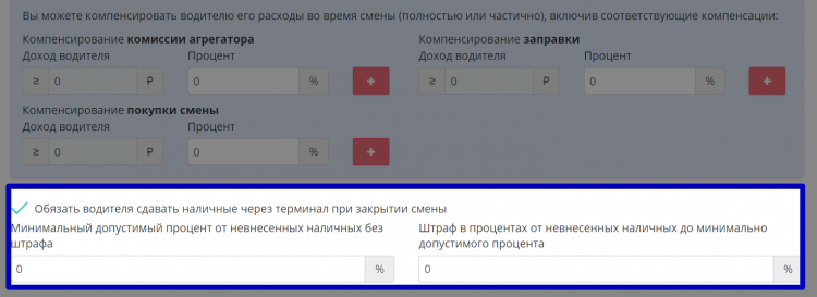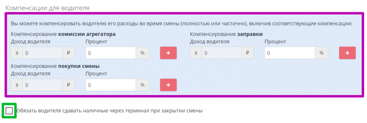 - Построение системы компенсаций водителям – данный блок параметров предназначен для установки значений и условий возмещения шоферам расходов на оплату топлива, комиссий агрегаторов и покупки смен.