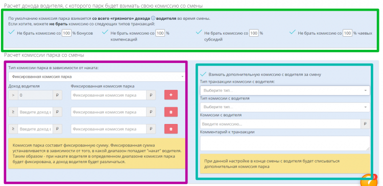 Кроме этого модуль «Управление сменами» поддерживает включение дополнительных сборов с водителей, которые позволяют парку создать резервный фонд для нейтрализации последствий форс-мажорных обстоятельств.