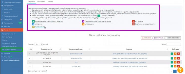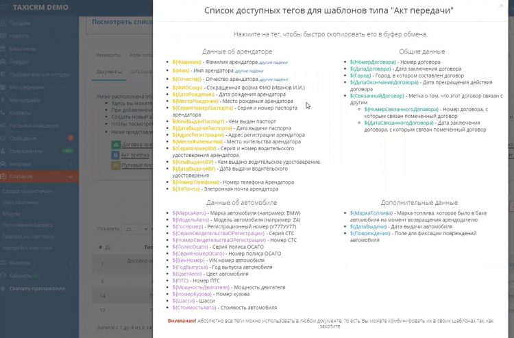 Рассматриваемая платформа также умеет автоматически генерировать электронные варианты документов по шаблону, который владелец парка загрузит в taxiCRM.