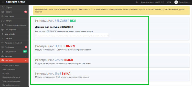 Кроме этого taxiCRM спасает водителей такси от бензинового коллапса. Она поддерживает интеграцию с популярными системами топливных карт. Поэтому потраченные на этих заправках средства автоматически списываются с баланса водителя и учитываются при взаиморасчетах между таксистами и автопарком. Что позволяет его владельцу быстро получить отчет о «проливе» любого топлива.