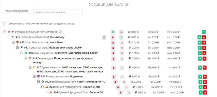 - Тонкая настройка тарификации смен – при создании тарифа владелец таксопарка может задать тип транзакций, с которых будут взиматься комиссионные, и их процентную ставку. А также создать неограниченное количество условий формирования комиссии в зависимости от полученного дохода за смену.