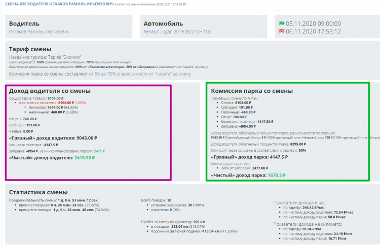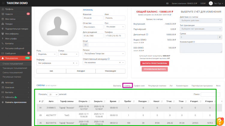 - Предоставляет детальную статистику по каждой смене водителя – эти данные отображаются на странице пользователя в CRM (вкладка «Смены»).
