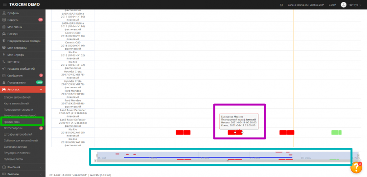 - Предоставляет статистику по сменам и по каждой машине в более понятной форме – на интерактивном графике руководителю таксомоторной компании проще понять, какие автомобили и когда простаивали.