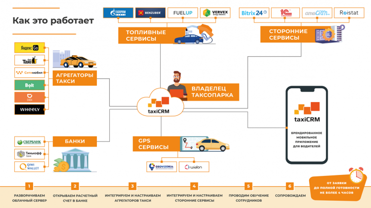 В России частный таксомоторный бизнес развит хорошо. Но это молодая отрасль, которая находится на этапе становления. Поэтому отечественные таксопарки еще не пришли к единым стандартам, и каждый из них работает со свойственными только ему особенностями. И, видимо, taxiCRM, способна учитывать все эти особенности. В том числе благодаря большому количеству модулей, реализующих интеграцию с множеством сторонних сервисов через открытый API платформы.