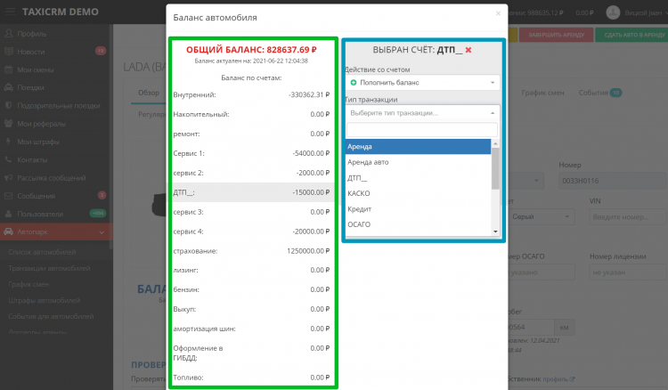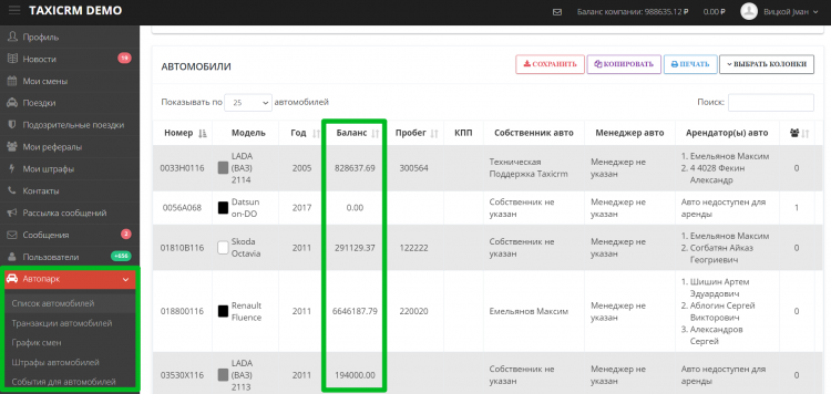 taxiCRM решает эту проблему. В разделе «Автопарк» отображается данные по каждому автомобилю. В том числе и финансовый баланс.