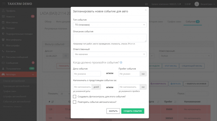 Кроме этого taxiCRM облегчает мониторинг состояния автопарка. Чтобы не пропустить очередное ТО, достаточно в карточке автомобиля создать событие и установить его срабатывание на определенную дату.