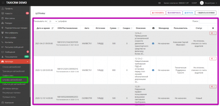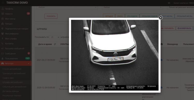 А еще крупным таксопаркам со своими автомобилями бывает трудно уследить за штрафами, которые прилетают от ГАИ. А если транспортным средством пользуются сразу несколько водителей, то виновного в правонарушении найти еще сложнее. Поэтому в taxiCRM появился специальный модуль. Он позволяет настроить автоматическую оплату штрафов и вычитать их сумму с виновников «торжества» - с того водителя, в чью смену произошло нарушение ПДД.