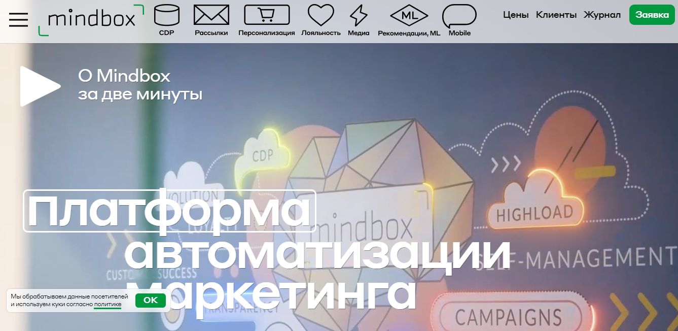 Mind box - облачная платформа для автоматизации маркетинга и управления клиентскими данными. Позволяет сделать маркетинг действительно клиент-ориентированным, без спама и неинтересных пользователям сообщений о скидках. Сервис объединяет данные, сегментирует и анализирует поведение покупателей, что дает возможность выработать действительно эффективную стратегию предложения товаров и услуг.