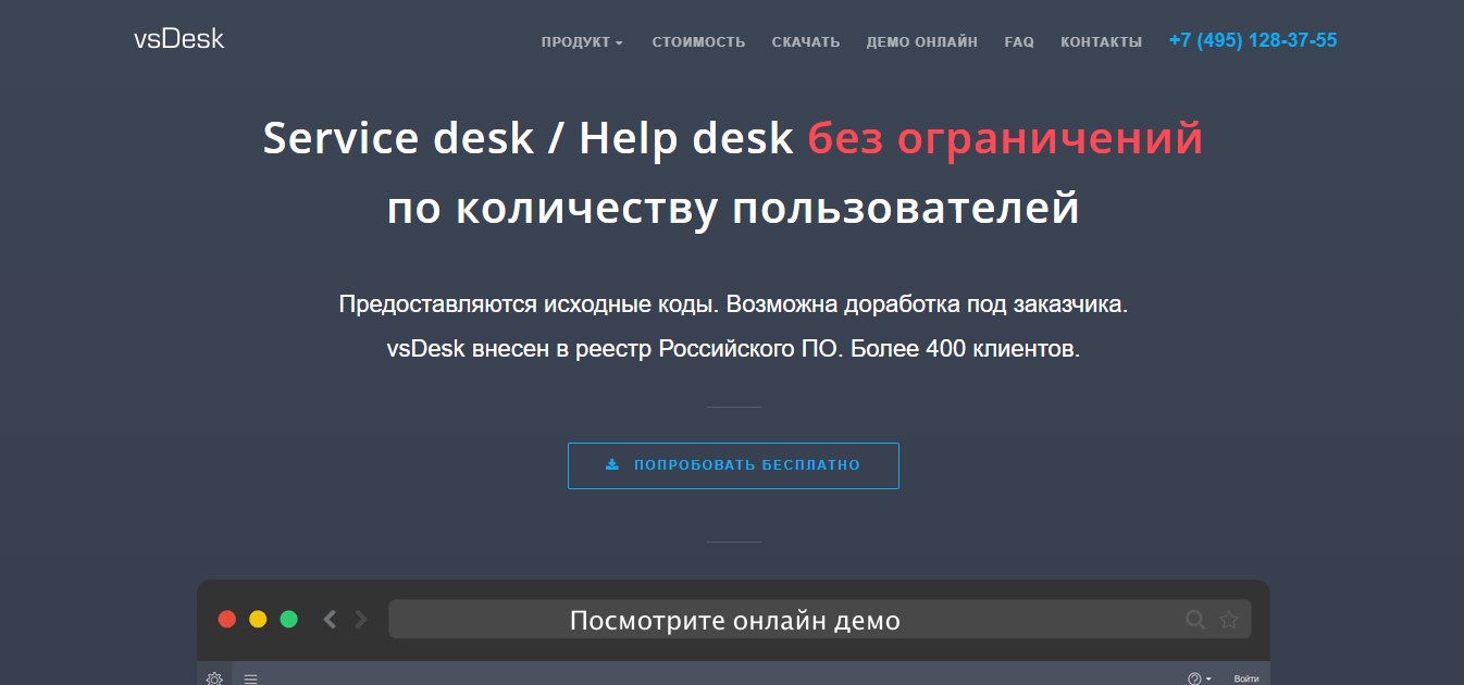 Имеется широкое поле для интеграции и расширения функций программы. Облачное и серверное развертывание. Бесплатный тариф vsDesk (демо сроком на год) на ограниченное число заявок и только для использования на своих серверах. Возможна доработка в соответствии с пожеланиями пользователя.