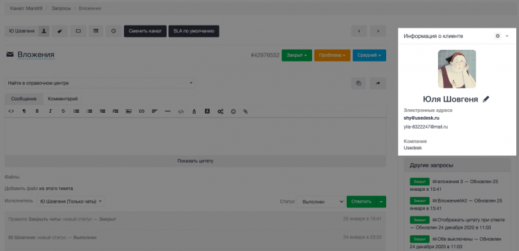 Функция появилась в разделе "Чат", "Запросы", "Клиенты", а также работает в браузере мобильной версии.