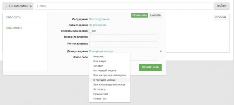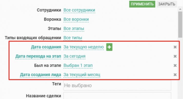 Таким образом Вы сможете конкретнее отфильтровать данные, например, найти сразу сделку по дате создания и по дате перехода на нужный этап.