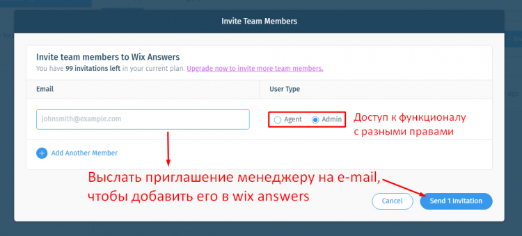 Менеджеров можно приглашать через “Settings” - “Team Members”, указав их e-mail адреса. Им присваивается один из статусов - Agent или Admin. Первые могут публиковать статьи, отвечать на тикеты и звонки. Вторые получают полный доступ к функционалу Wix Answers за исключением биллинга.