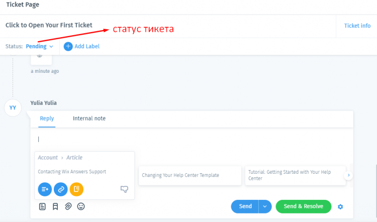В тикетах можно изменять статусы, добавлять смайлы, ссылки на статьи из центра поддержки.