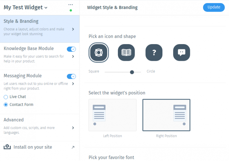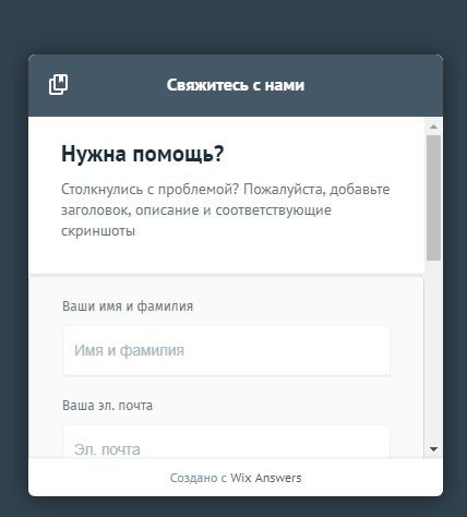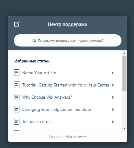 Он включает до 2х блоков: модуль базы знаний и модуль сообщений (на выбор - контактная форма или живой чат). Можно выбрать язык виджета. По умолчанию он будет таким, какой вы указали при регистрации в сервисе Wix Answers.