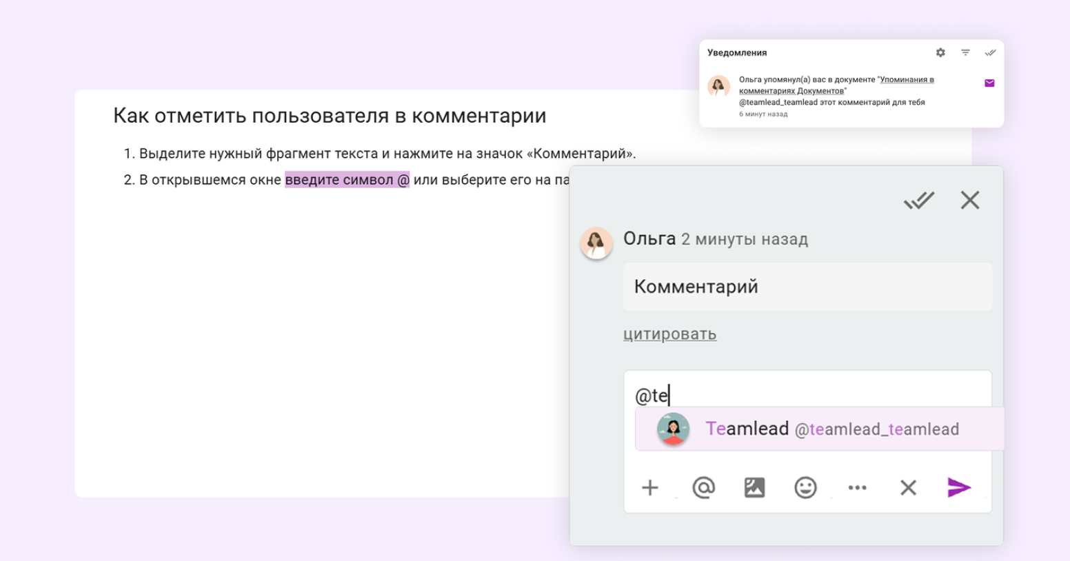 Комментарии и упоминания. Поддерживаются комментарии через @ — человек получит уведомление;