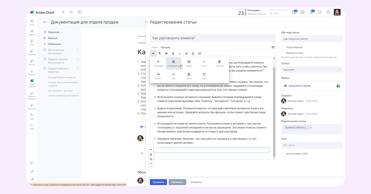 Документы и заметки — не приоритет для сервиса. WEEEK — изначально таск-менеджер и CRM-система. Если нужна строгая структура, сложные взаимосвязи, история версий документов и надежное хранение, то стоит выбрать другой сервис;