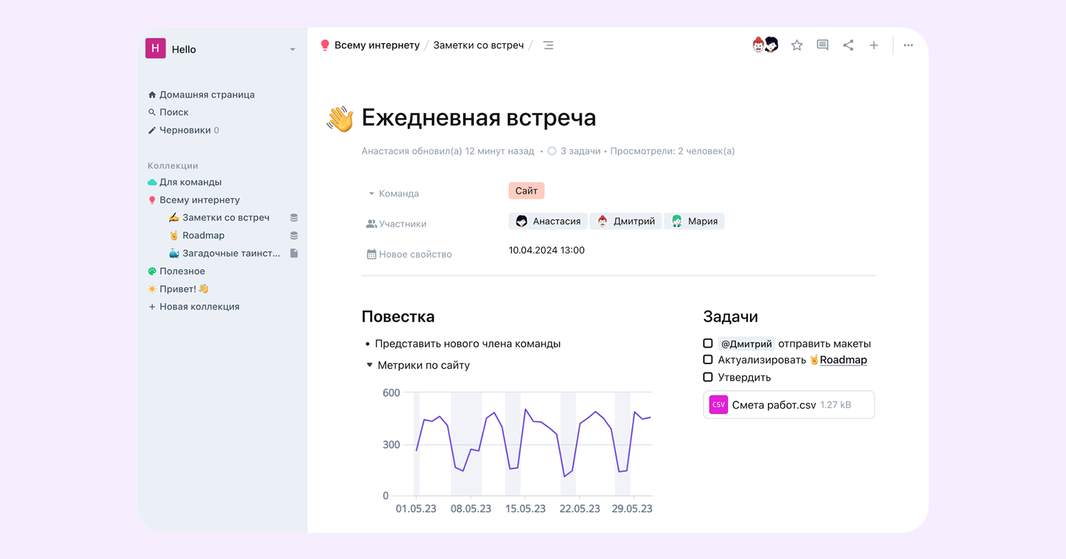AI-помощник. Он поможет систематизировать и дополнять заметки, находить похожие записи и быстро просматривать наиболее релевантный контент. Также может создавать резюме и стенограммы ключевых разговоров.