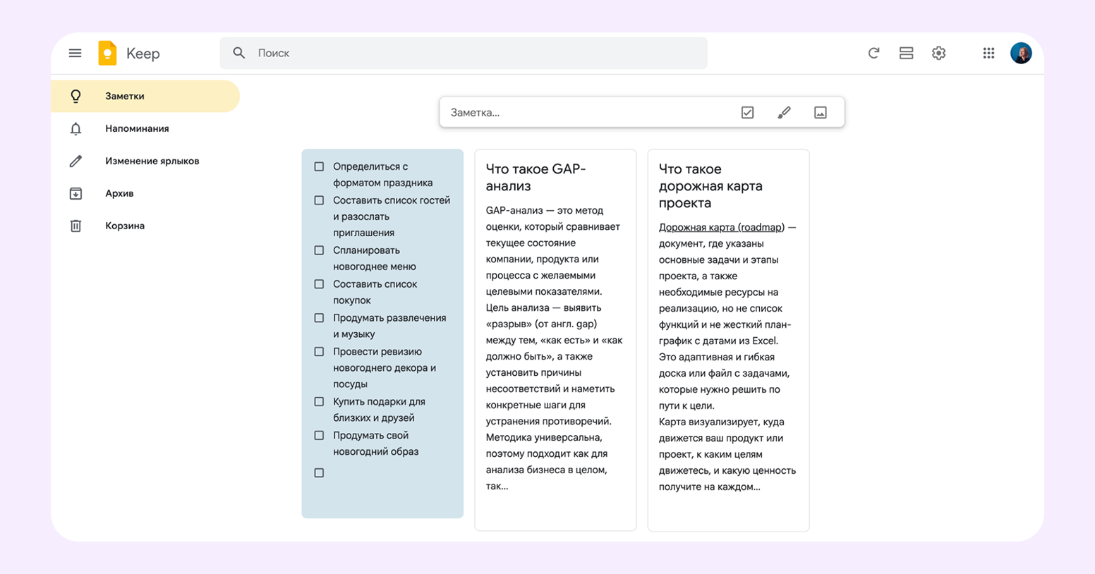 Google Keep — это простая программа для заметок от Google. Она входит в пакет Google Workspace. Подходит для быстрых записей, фиксации идей, списков покупок, напоминаний.