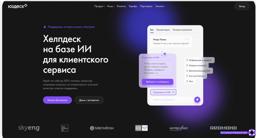 Платформа на базе ИИ для клиентского сервиса. ИИ-функции автоматизируют общение, ускоряют ответы, помогают повысить лояльность и снизить нагрузку на операторов. Контроль качества, ИИ-помощник, аналитика, омниканальность, 200+ интеграций.