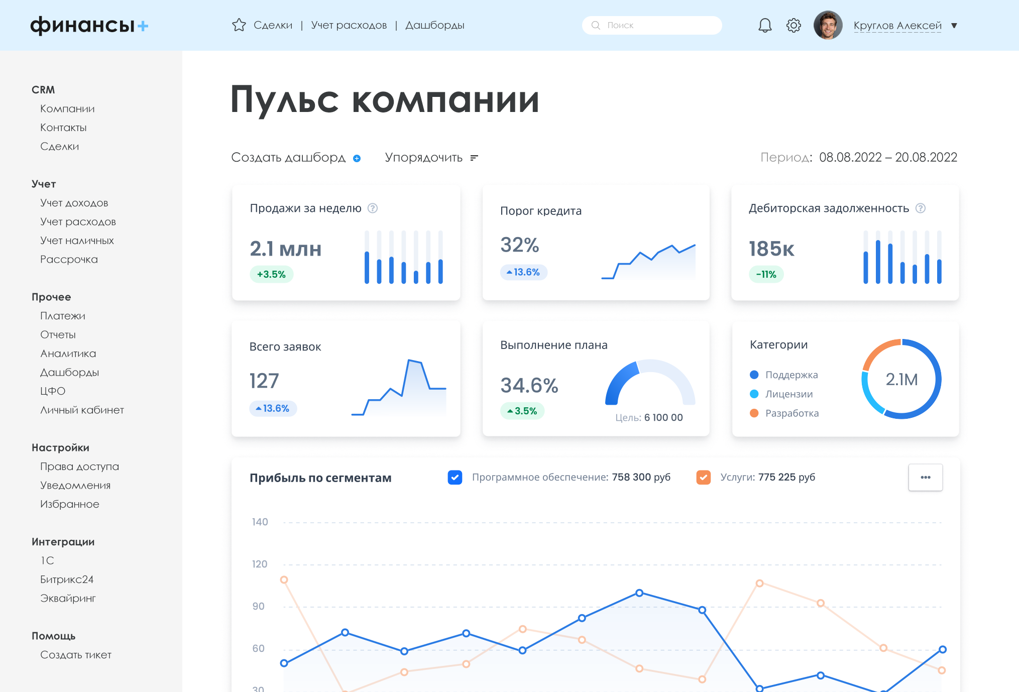 Сервис позволяет в полной мере вести учет денежных средств, сокращает дебиторскую задолженность, сокращает кассовые разрывы и учитывает наличные поступления. Интегрируется с CRM и банками: Битрикс24, 1С, ЮКасса, Сбер, Тинькофф и другими. Позволяет анализировать прибыль от каждой сделки, контролировать выручку и расходы с помощью дашбордов