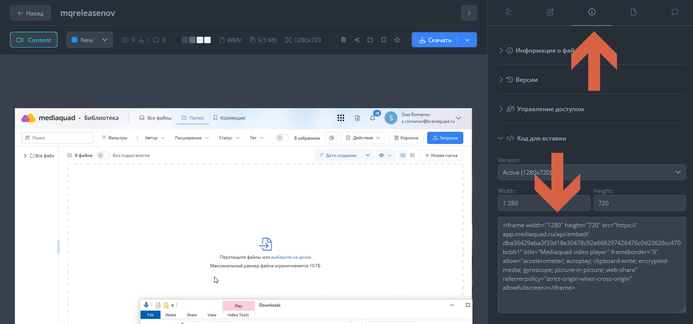 Дальше всё просто: открываете «Информацию» о файле, выбираете «Код для вставки». Можете изменить настройки — поменять размер плеера или соотношение сторон, если стандартный вариант не подходит. Когда всё готово, копируете код.