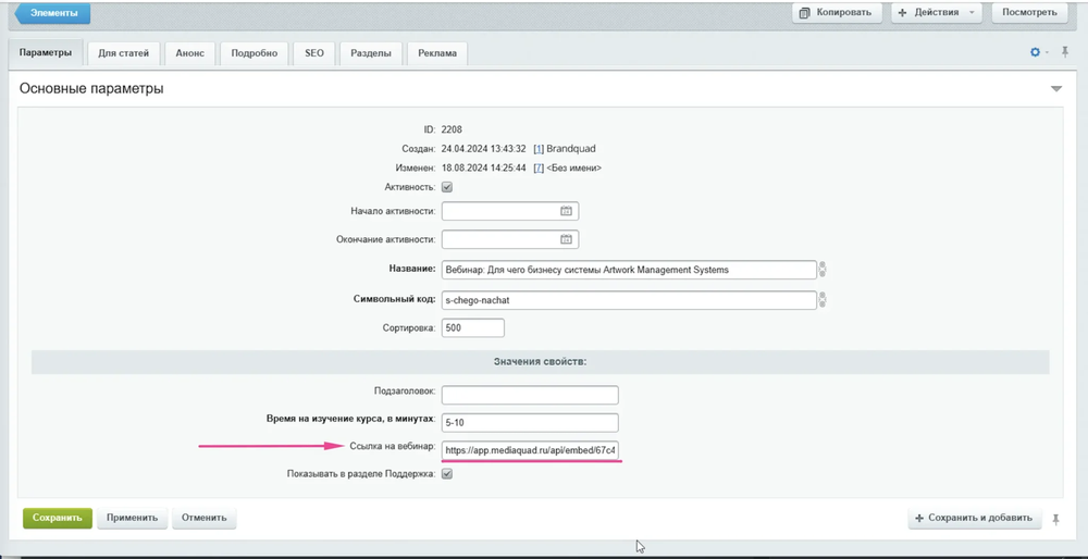 Когда поле готово, возвращаемся в Mediaquad. Нам нужна именно ссылка из плеера — она находится внутри кавычек в коде. Копируете её и вставляете в нужное поле инфоблока. Вот и всё — видео встроено и будет отображаться так, как вы настроили.