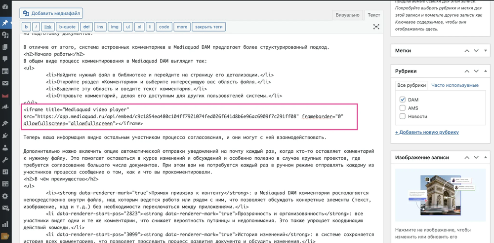 С WordPress история немного другая. Здесь важно не ошибиться с режимом редактирования. Когда создаёте или редактируете страницу, переключитесь на режим «Текст» — не визуальный редактор, а именно текстовый. Туда и вставляете скопированный embed-код из Mediaquad.