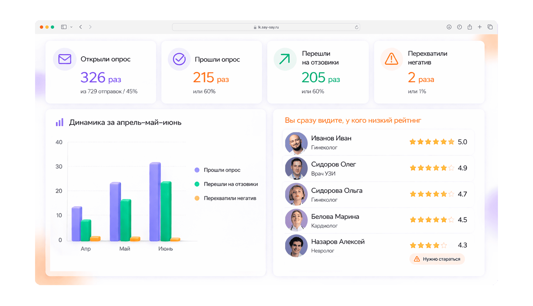 Довольный клиент направляется на Яндекс Карты, 2ГИС, Продокторов или Google. Недовольный - его отзыв получает только руководитель, до публикации в интернете. Рейтинг растёт, негатив перехватывается.