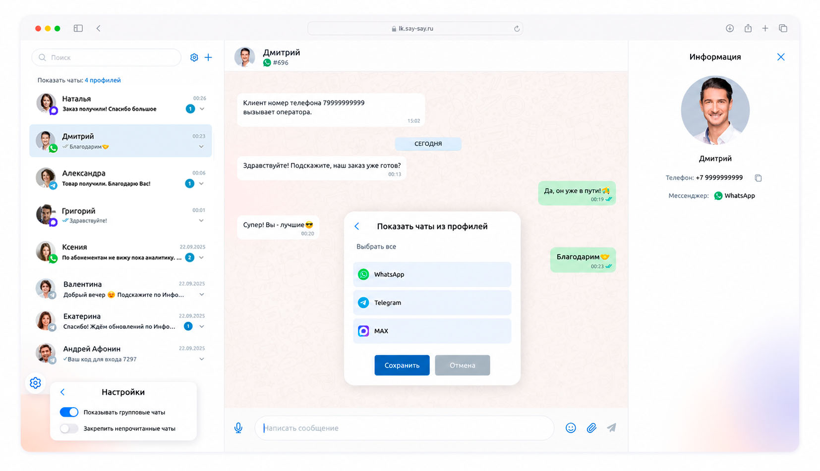 Say Say берёт на себя всю рутинную коммуникацию с клиентом автоматически через мессенджеры: